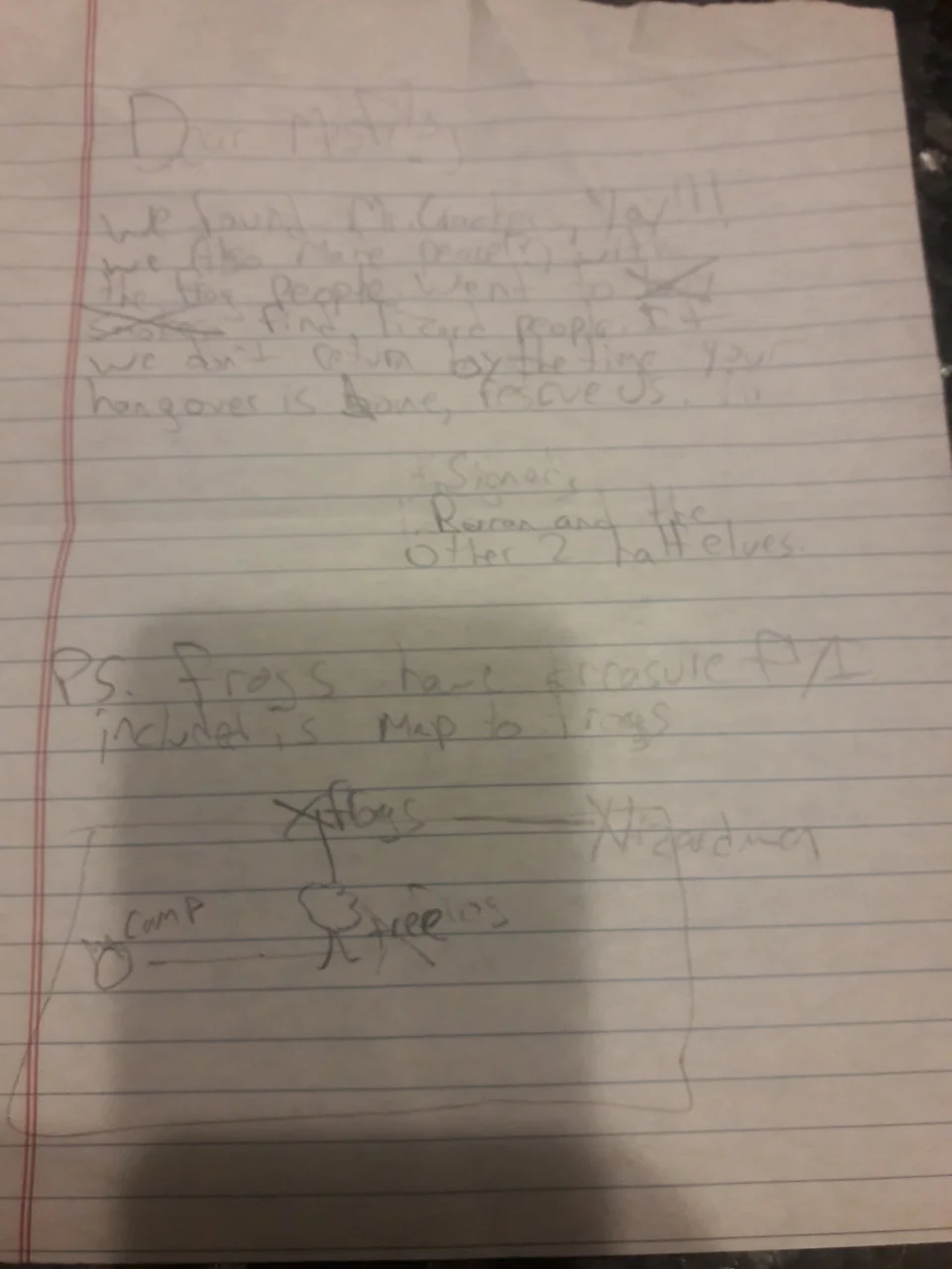 As we left the party, they had just survived an attack by a coordinated warband of bullywogs (frog-men) by the skin of their teeth. Michael healed Leah, Barron, and Kevin so the three party members could follow the escaping bullywog and hopefully catch it before it could warn any others. The rest of the party made camp, and woke up the next morning with a note pinned to one of their backpacks.