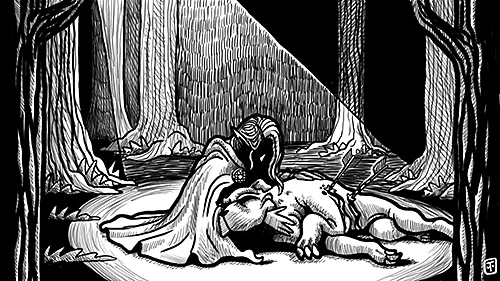 With Leah in the fury and the rest of the party close behind, the warrior-woman fell almost before she finished untying her companion, who lasted only a minute or two longer. But the possible Princess had ridden off into the distance, and Leah was too beset with grief to track her immediately. She rushed to her dog, tears welling in her eyes, but the brave animal had life enough for only one last action: his tongue licked her tears away as rain began to fall, with only Thic Duc’s lantern many yards back to give faint illumination to the tragic scene of farewell. Of the Fourth Godsday of the Harvester (Tiberium)