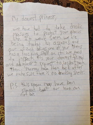 The group convinced the princess to return to her human form easily enough, though in order to accomplish it they first trapped her in a small ship’s cabin halfway between Restenford and Highport. Amathar had prepared ahead of time by casting his Detect Magic spell, and identified a tiara and two rings as being enchanted once the Princess was human once more. Warin immediately began casting a small – Silence 15’ radius. The Princess tried to slap him, but failed to interrupt his spell. An increasingly furious Princess, gesturing wildly, demanded to know what was going on through eloquent, if impolite, hand gestures. Barron handed her the note he had written in advance. Barron’s Note Barron’s Note