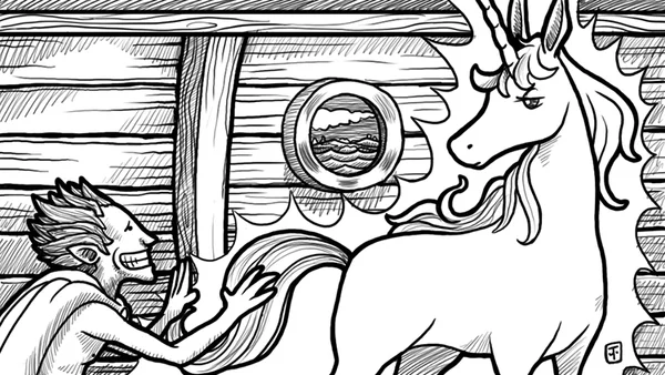 While Tiberium frantically began to pray, Barron tried to soothe the beast, which was threatening most of the group in turn with its horn. Leah was searching her memory for what she had learned about unicorns, coming up with the basics: horselike, dangerous horns, magical creatures, fond of maidens and virgins. Communicating the idea that all non-virgins should leave the room with hand gestures did not go well. The unicorn became even more agitated, and began striking the wall of the ship with its hind legs. It actually knocked a large hole in the hull. Ahira laid her hands on the haunch of the beast and shoved it to the side, so it would be unable to enlarge the hole further, and a moment later drew her hammer and swung at full force. Ahira missed, but the unicorn then shimmered again and turned into a hawk, diving for the hole.