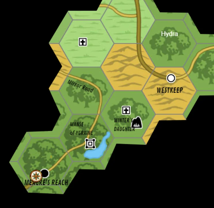 Several more days of travel in the forest brought us to a strange town of Maegre’s Reach, which had no young people at all. Except us, sort of (I’m older than I look). No one would say where the young people were. We found a few at the tavern, but they left when we tried to join them, without answering questions. The only other thing of note in the town was a statue in the central square. Eventually, we bought supplies and moved on.