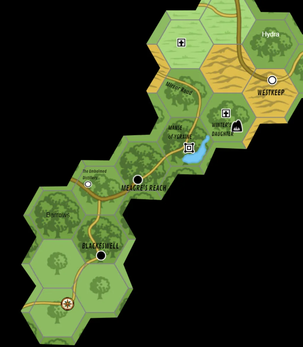 Blackeswell has only one inn; we stayed the night there, eating our own rations rather than the local fare. The locals did direct us to a nearby tavern with more of an active nightlife where Gillian, a waitress who had seen better days (and kept looking back on them), fed us the local rumors. Supposedly there is an evil hag living on an island in the black.