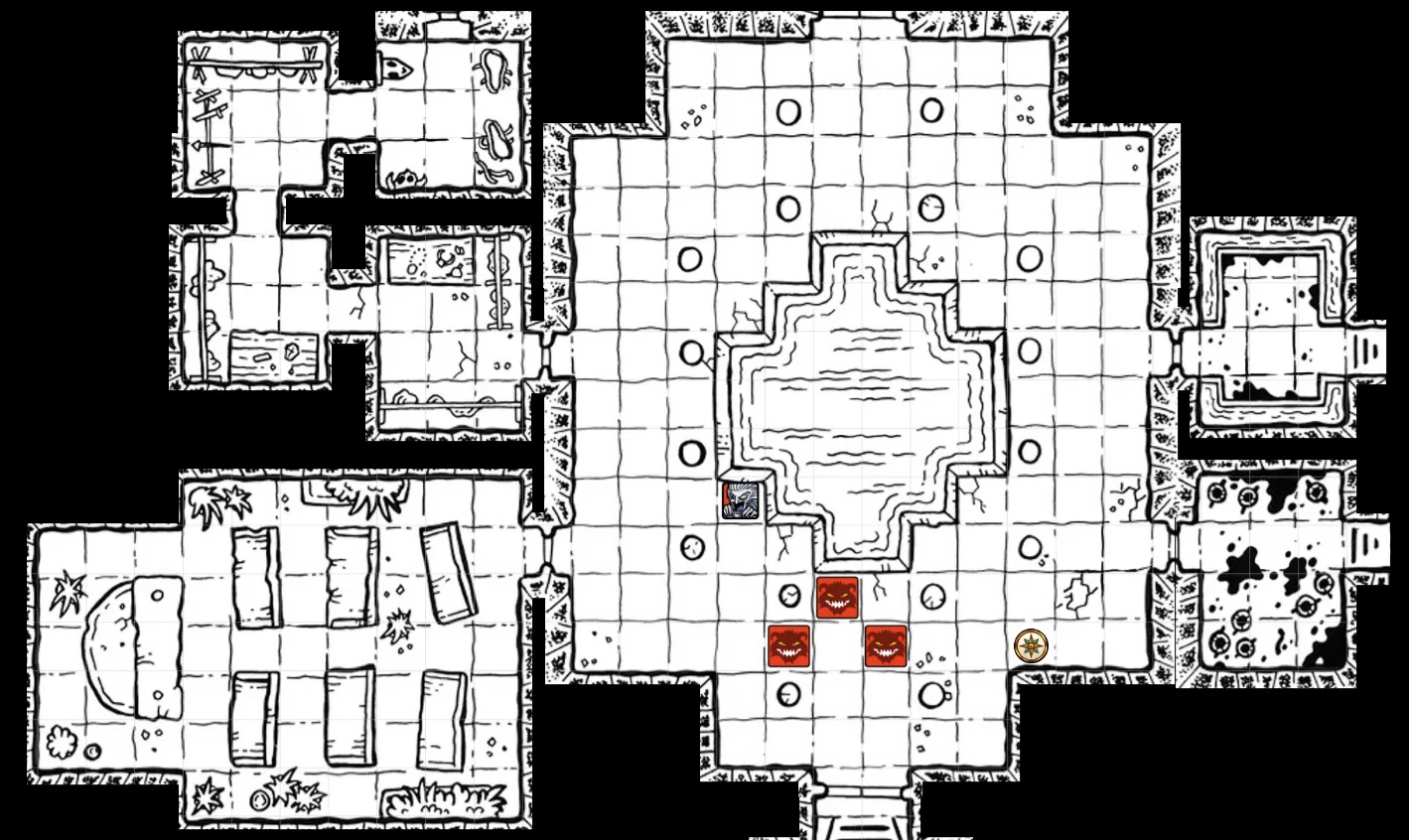 We explored the rest of the small series of rooms that seemed to hold discarded equipment. The four pouches held 400gp, which we did not yet divide up among us. One room had barding for a horse, and another 4 sets of plate mail, along with an assortment of weapons. There’s value in those rooms, if we can get it out safely. The most interestikng room was the last, which had visible (and audible) ghosts along with a bricked-up doorway north.