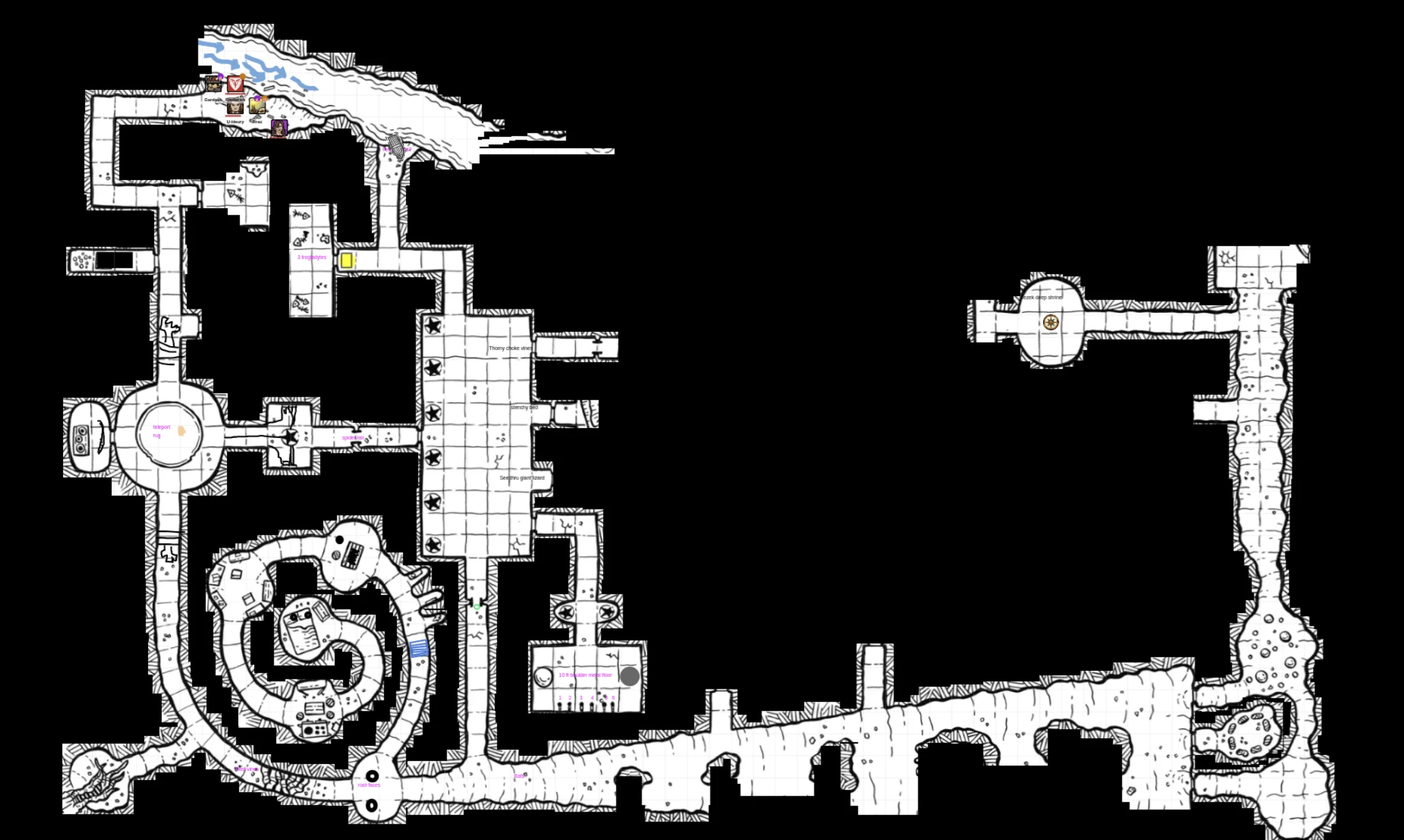 The other two doors led to a connected set of rooms. The southern rooms had a dead iguana being eaten by glowing beatles. We snuck past them, being quiet and without carrying a light, and went north. A room with heavy stalag… mites? Yes, mighty tighty ceiling rocks. We snuck around the edges and didn’t find anything but another corridor heading north, this one ten feet wide and smelling of bovine excrement. Seemed likely we would find a bull somewhere this way. The walls in the corridor had these strange, deep holes, but I wasn’t about to stick my hand down one.