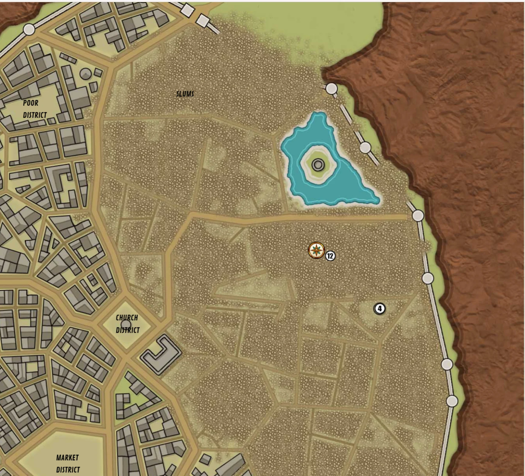 Of course, u-Heury had other plans to find adventure. He joined a group of kids and persuaded them to guide him into a cave in the ruined section of town where they had heard orcs. One of the kids was even brave enough to hold our lantern in return for a gold piece. Landon scouted first, and reported three orcs discussing a difficult decision. We entered, and spoke with them, Landon (who speaks orc fluently) translating. The orcs agreed to leave the city peacefully, heading north. We let them go. The kid – not u-Heury, the new one – was impressed.