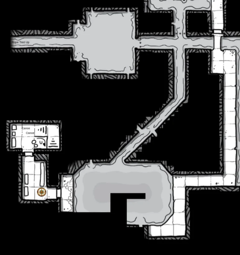 Oscar hired two men to come along. One is twitchy. We hired some of Thomas’ friends to watch the wagon. I warned them what would happen if the wagon and our stuff wasn’t there when we got back. We dropped the canoes in the hole and climbed down the rope. The portcullis that had been up was now down. The men made me get out in the muck and lift it up. We wedged it up so we could get back out. Before we went to the last place they saw were rats, we decided to explore south. South led to a deep pool which was full of shit. This must be the intake area. For the whole city. It reeked. There was a walkway and a door on the other side.