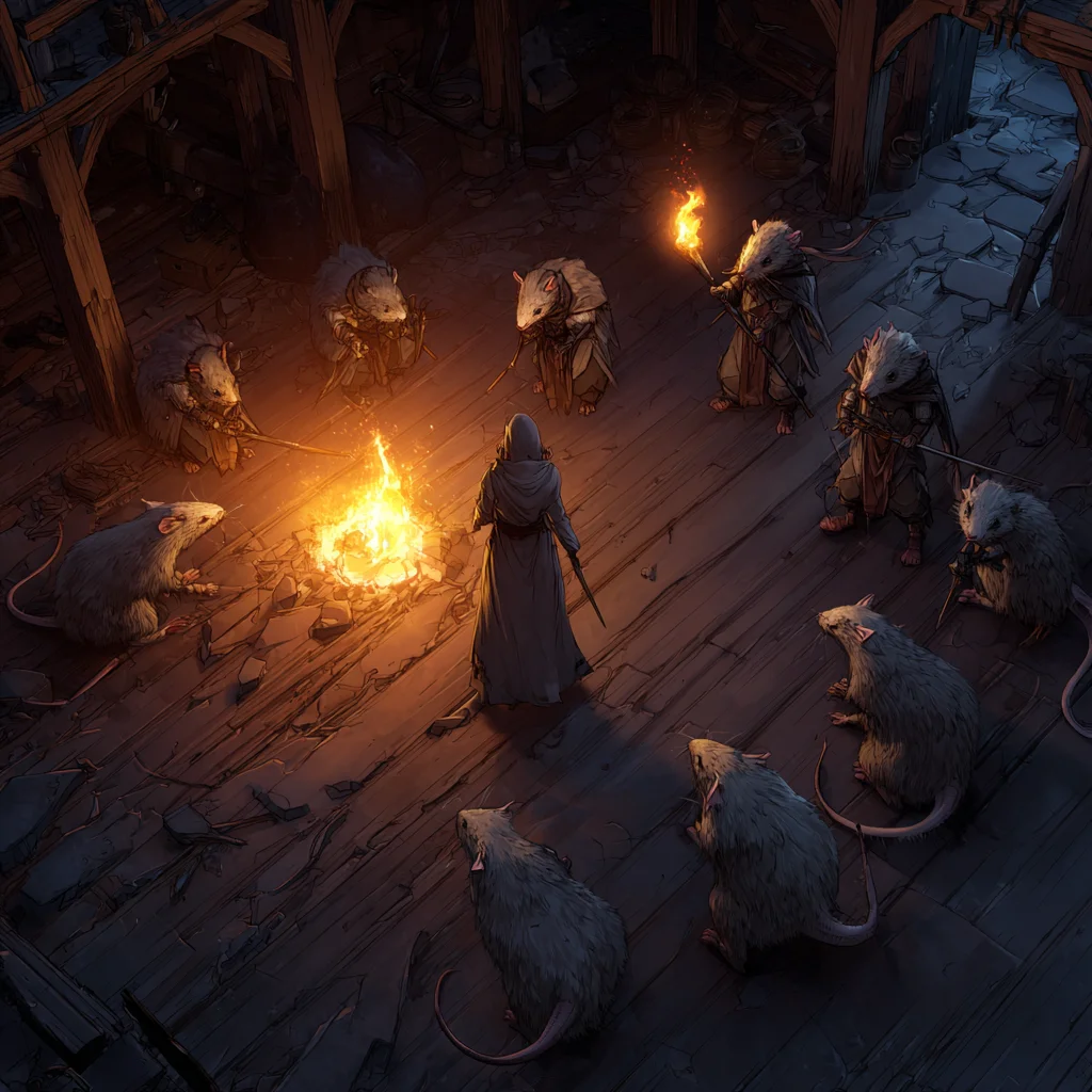In a moment of desperate inspiration, Bruzra burst from the chamber and began an elaborate dance in the corridor, her movements hypnotic and strange. The rats that had resisted Druidly’s sleep magic found themselves transfixed by her performance, swaying in place as if caught in a trance.