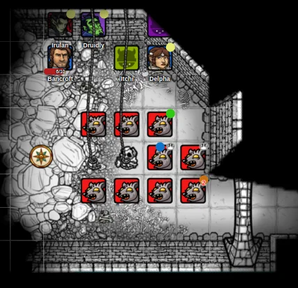 As their torch failed once again, Irulan and Bancroft found themselves groping through the darkness toward the ropes, guided only by the sounds of their companions above and the skittering of approaching rats. In the chaos, Druidly took another bite from the pursuing vermin, and he too felt the telltale burn of infection spreading through his system.