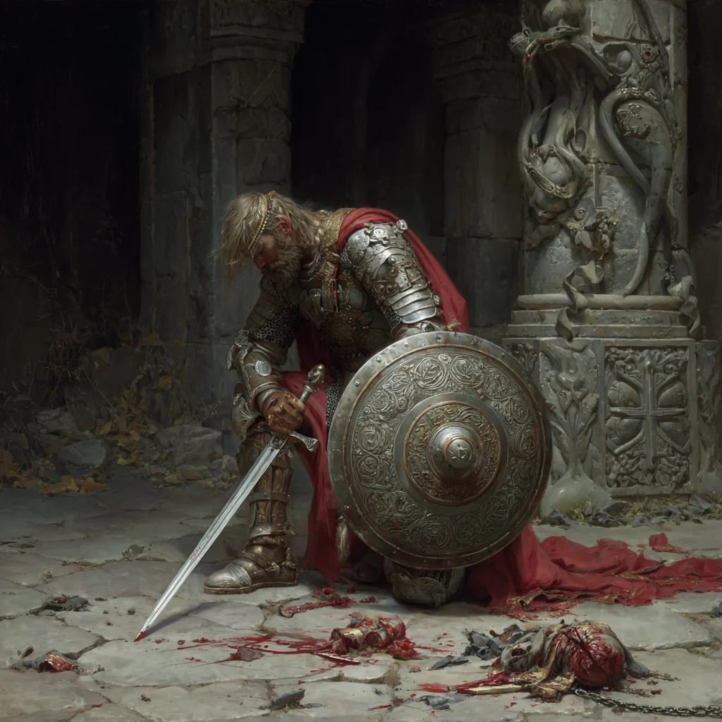 The weight of debt pressed upon Bancroft’s shoulders like a funeral shroud. The church of St Ygg had demanded payment for their divine intervention—the Cure Disease that had saved him from the festering rot of a rat’s bite. Now penniless, the former farmer trudged through the rain-slicked streets to the soup kitchens, his chainmail gleaming incongruously among the ragged masses. His jeweled sword marked him as a man fallen from grace, a warrior reduced to begging for scraps.